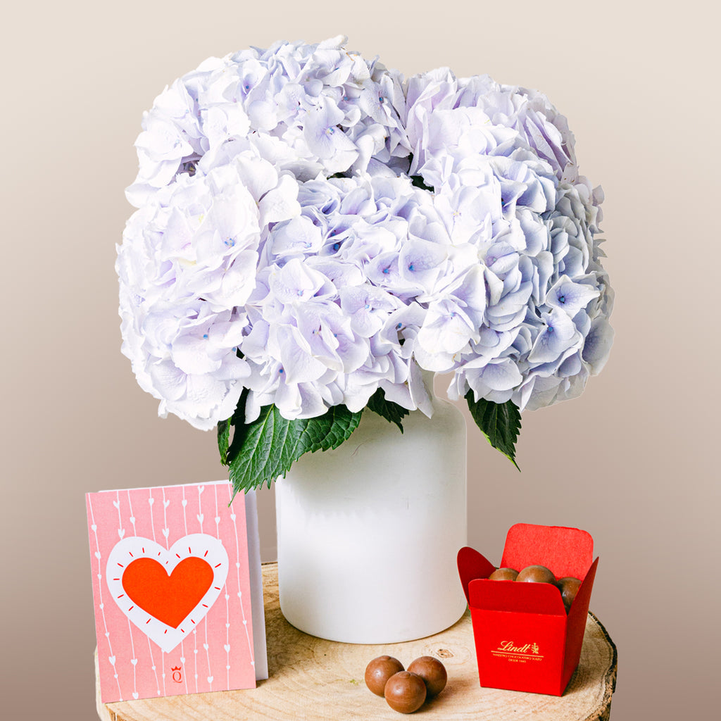 As hidrangeas azuis simbolizam gratidão e emoções profundas, tornando este buquê um gesto sincero e atencioso.