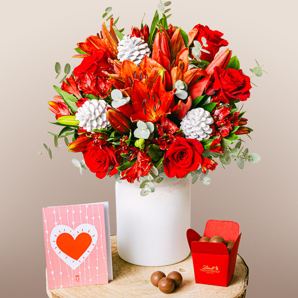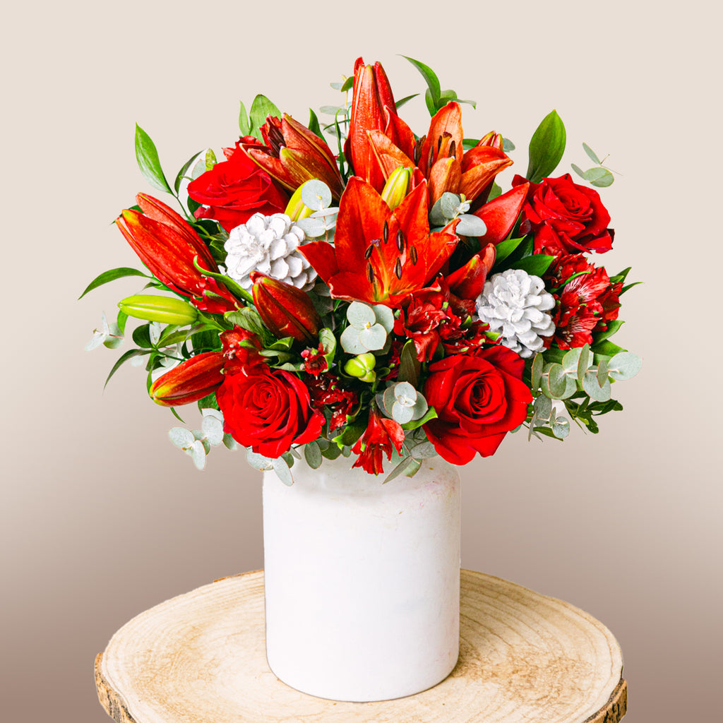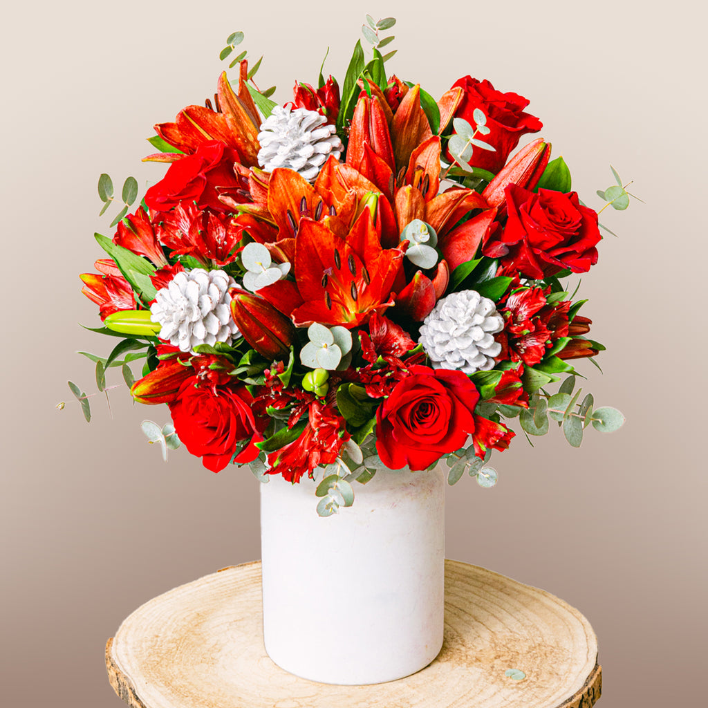 Este elegante buquê aposta no vermelho, a cor clássica para dar sorte. Os lírios, rosas e alstroemérias são complementados pelo detalhe das pinhas, tornando este buquê um presente de Natal perfeito. Envie para alguém que está longe e faça com que se sinta em casa.