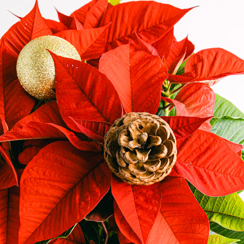 Graças às suas cores vibrantes e alegres, a poinsétia é um dos símbolos mais reconhecíveis do Natal. Decorada com bolas douradas e pinhas natalinas, esta poinsétia vem em uma cesta de vime. É a maneira perfeita de surpreender alguém especial e desejar os melhores votos neste período festivo.