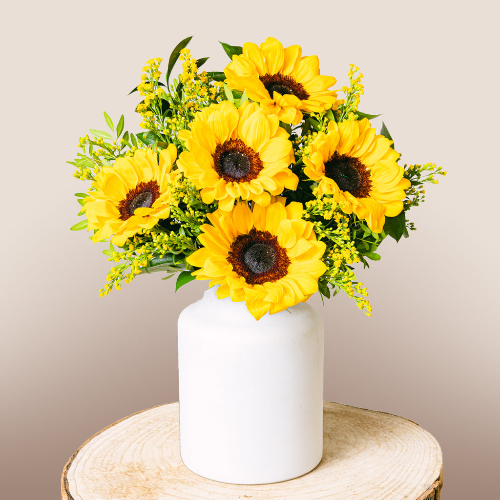 Nosso radiante buquê Golden Melody combina a alegria dos girassóis com a elegância do solidago, tudo isso envolto em folhas de aspidistra, lentisco e eucalipto. Este vibrante arranjo floral é perfeito para alegrar o dia de qualquer pessoa especial. Os girassóis, conhecidos por seu simbolismo de felicidade e vitalidade, combinam harmoniosamente com o solidago, criando um buquê repleto de energia e positividade. Ideal para comemorar um aniversário, um aniversário ou simplesmente alegrar o dia de alguém durante o verão, o buquê Golden Melody é a escolha perfeita. Faça seu pedido hoje mesmo e aproveite a rapidez e a segurança do nosso serviço de entrega em domicílio! Deixe que o brilho dos girassóis e a delicadeza do solidago transformem qualquer ocasião em um momento inesquecível.