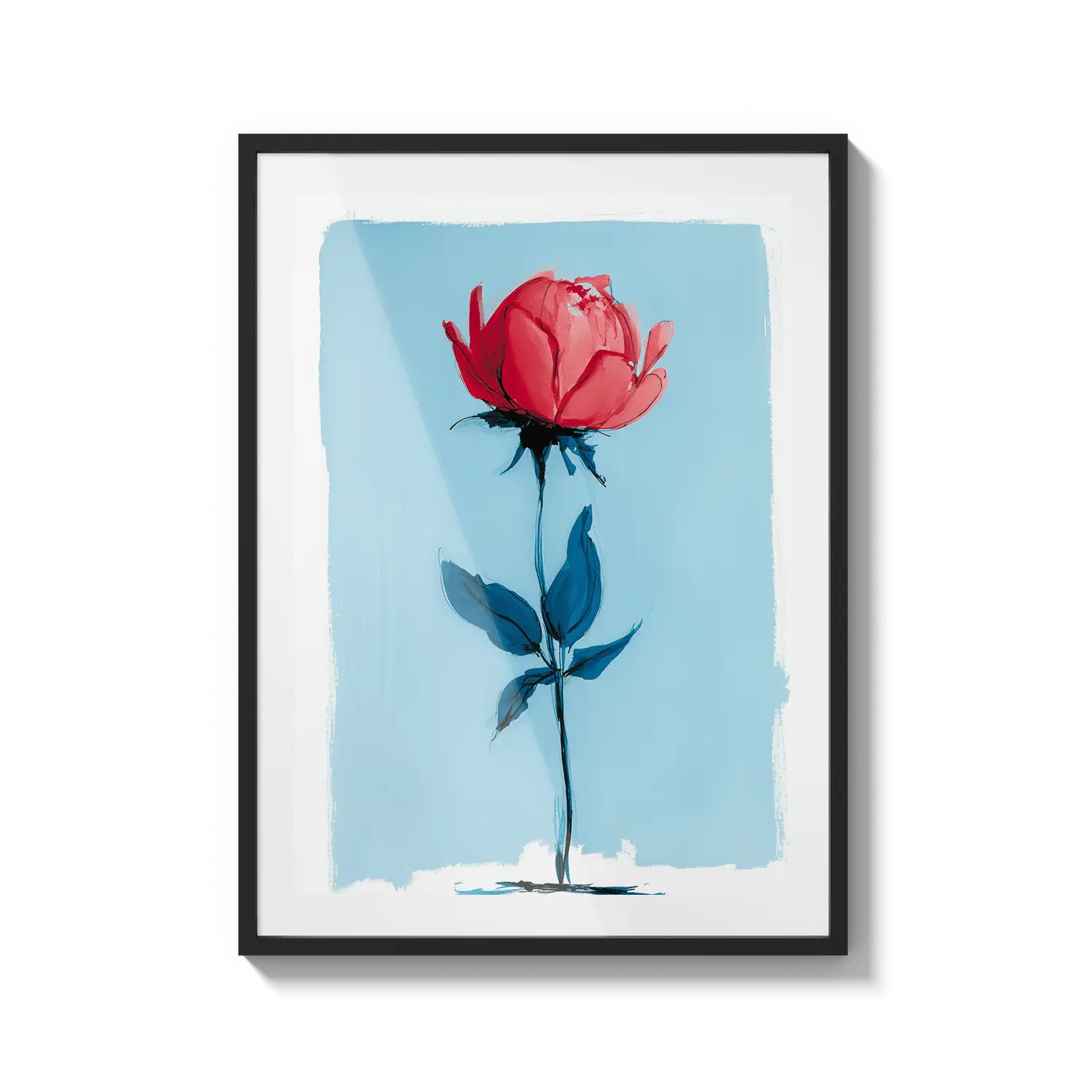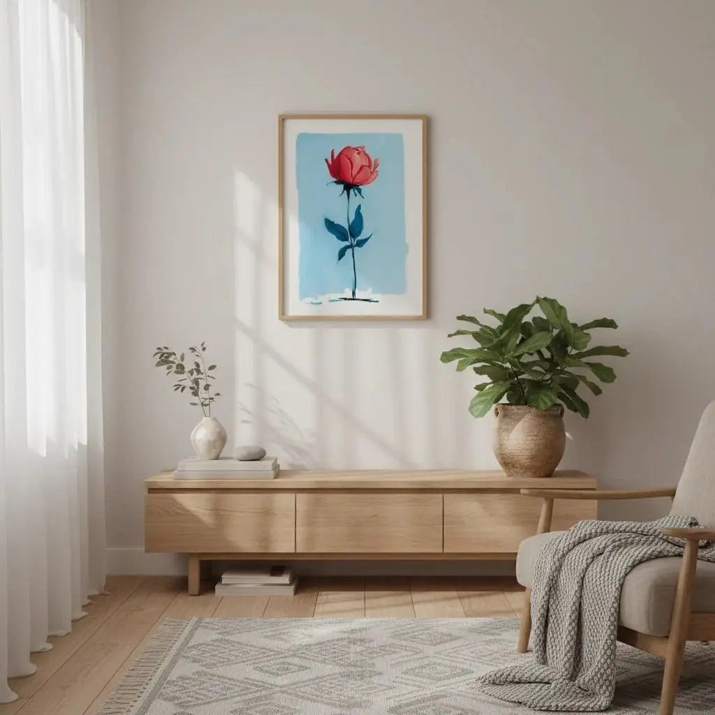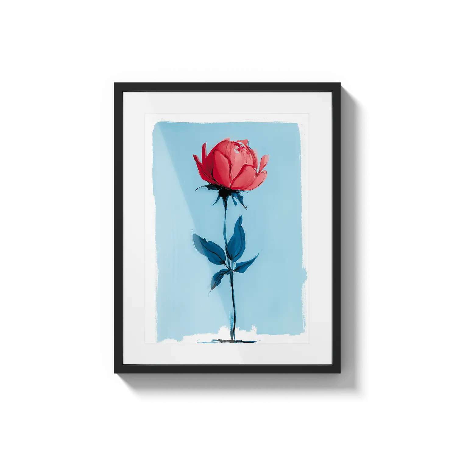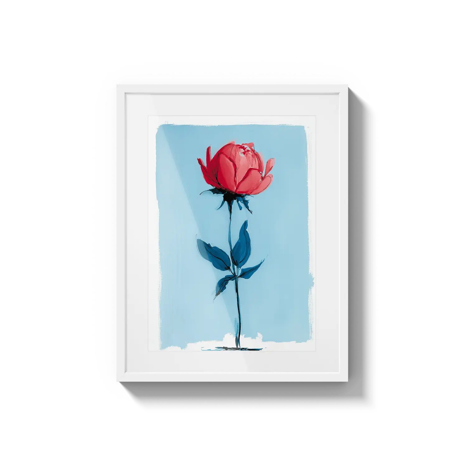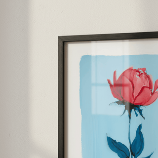 Uma rosa minimalista que se destaca com força delicada em um fundo azul suave. Um presente terno que fala com beleza discreta.