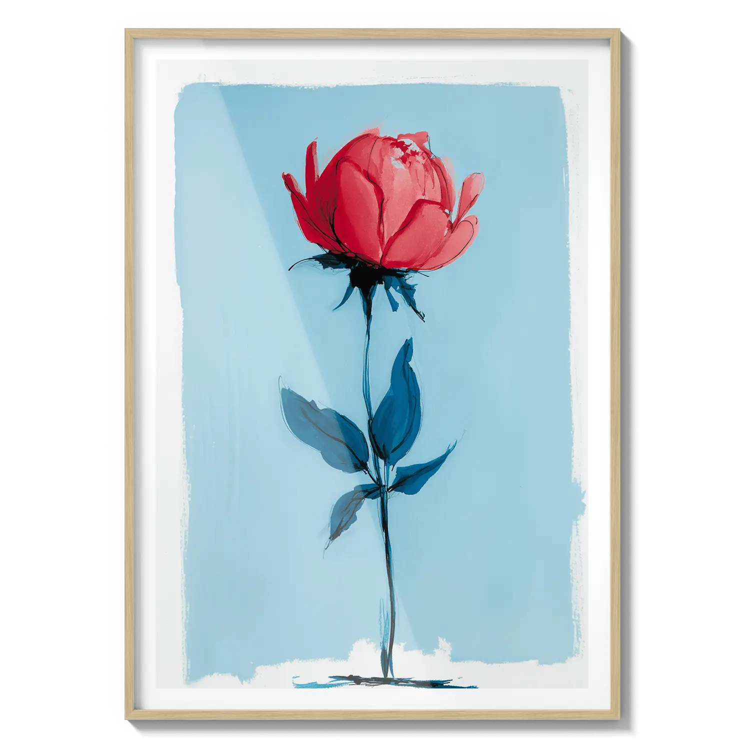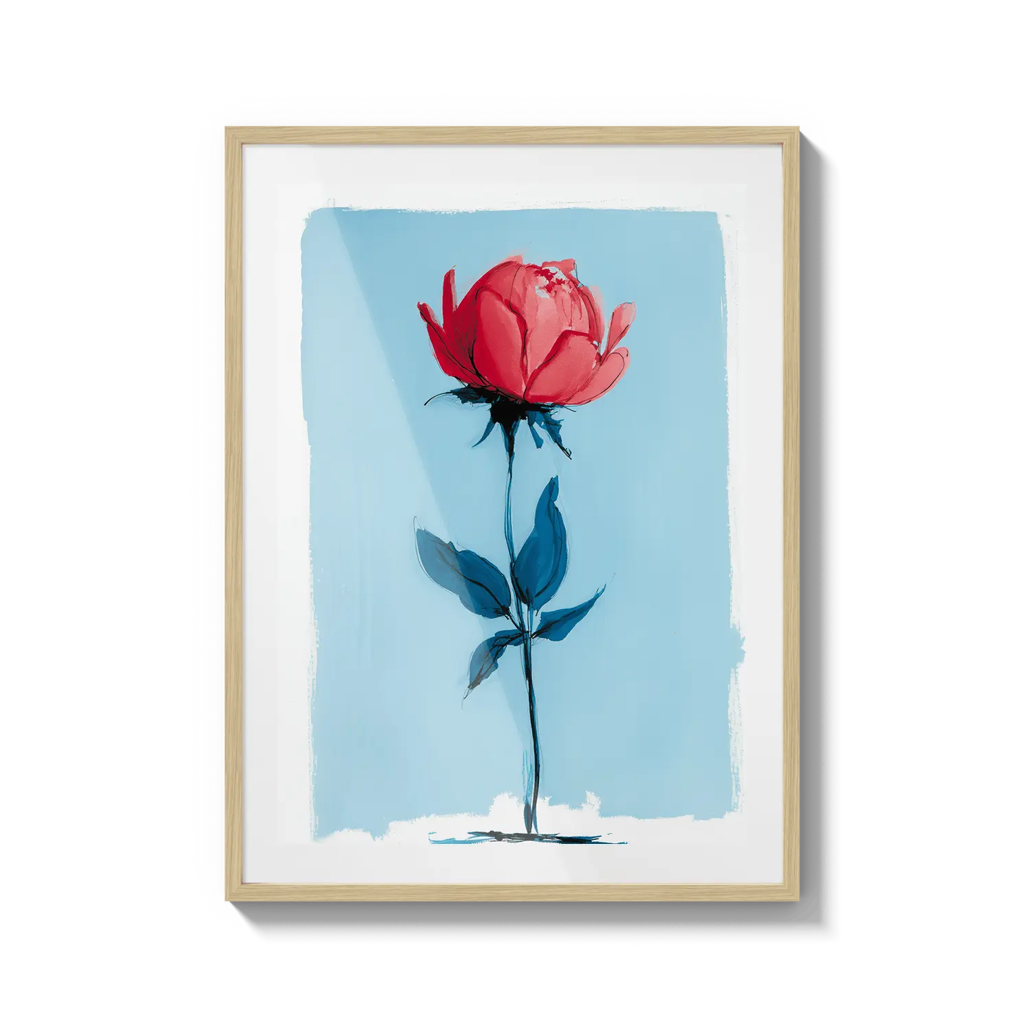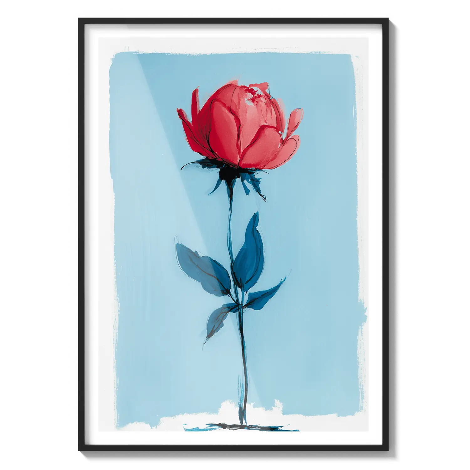 Uma rosa minimalista que se destaca com força delicada em um fundo azul suave. Um presente terno que fala com beleza discreta.