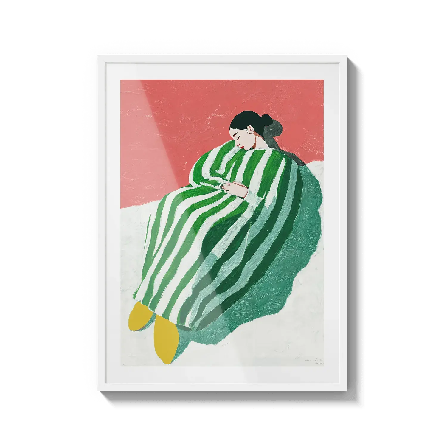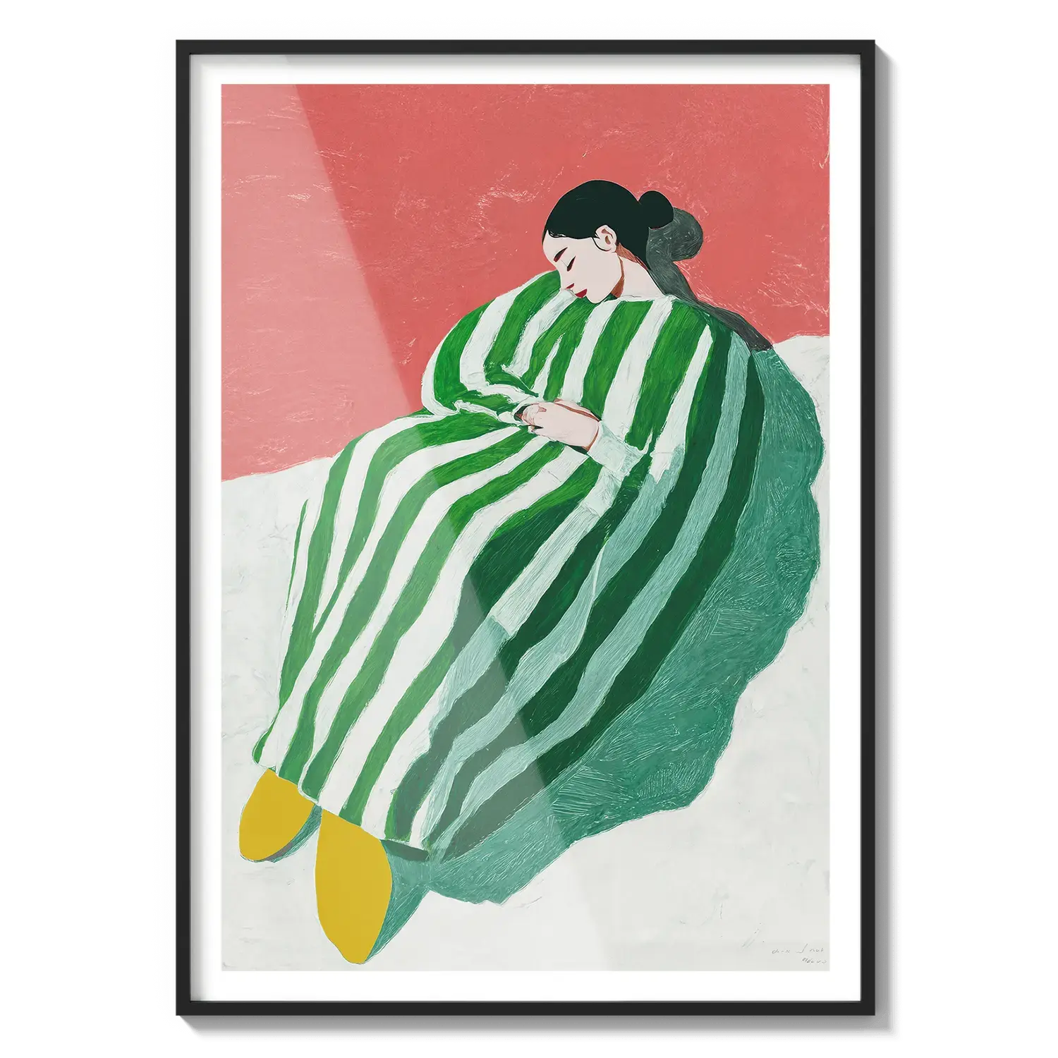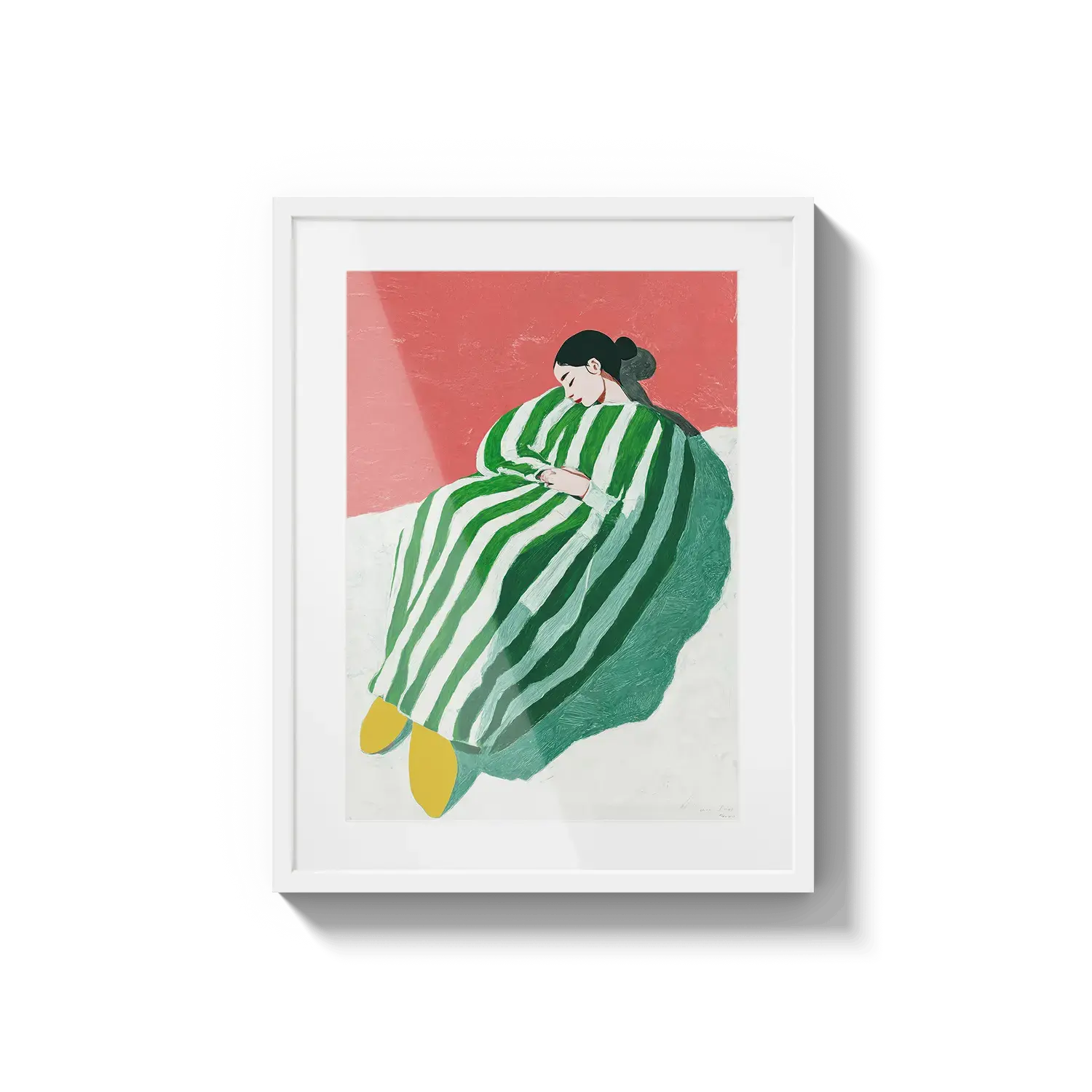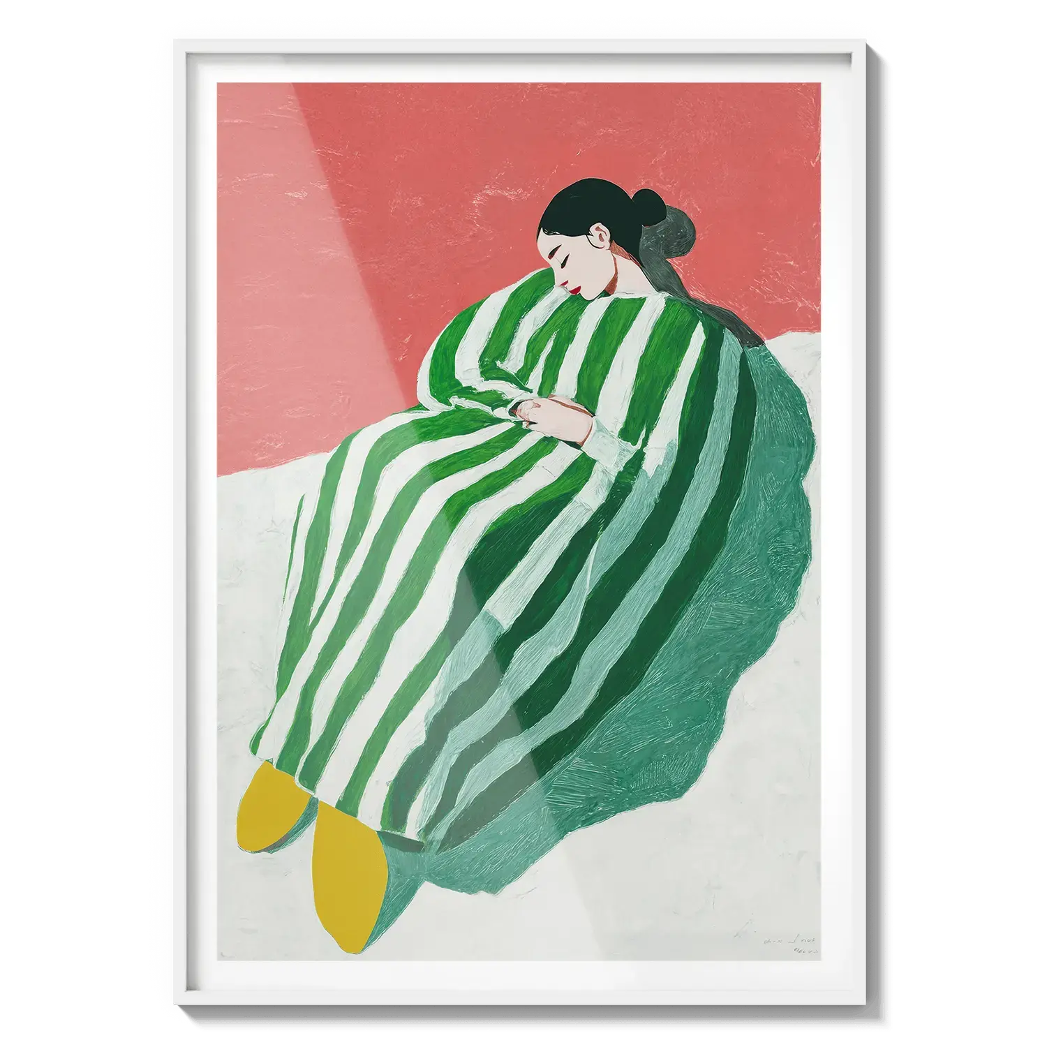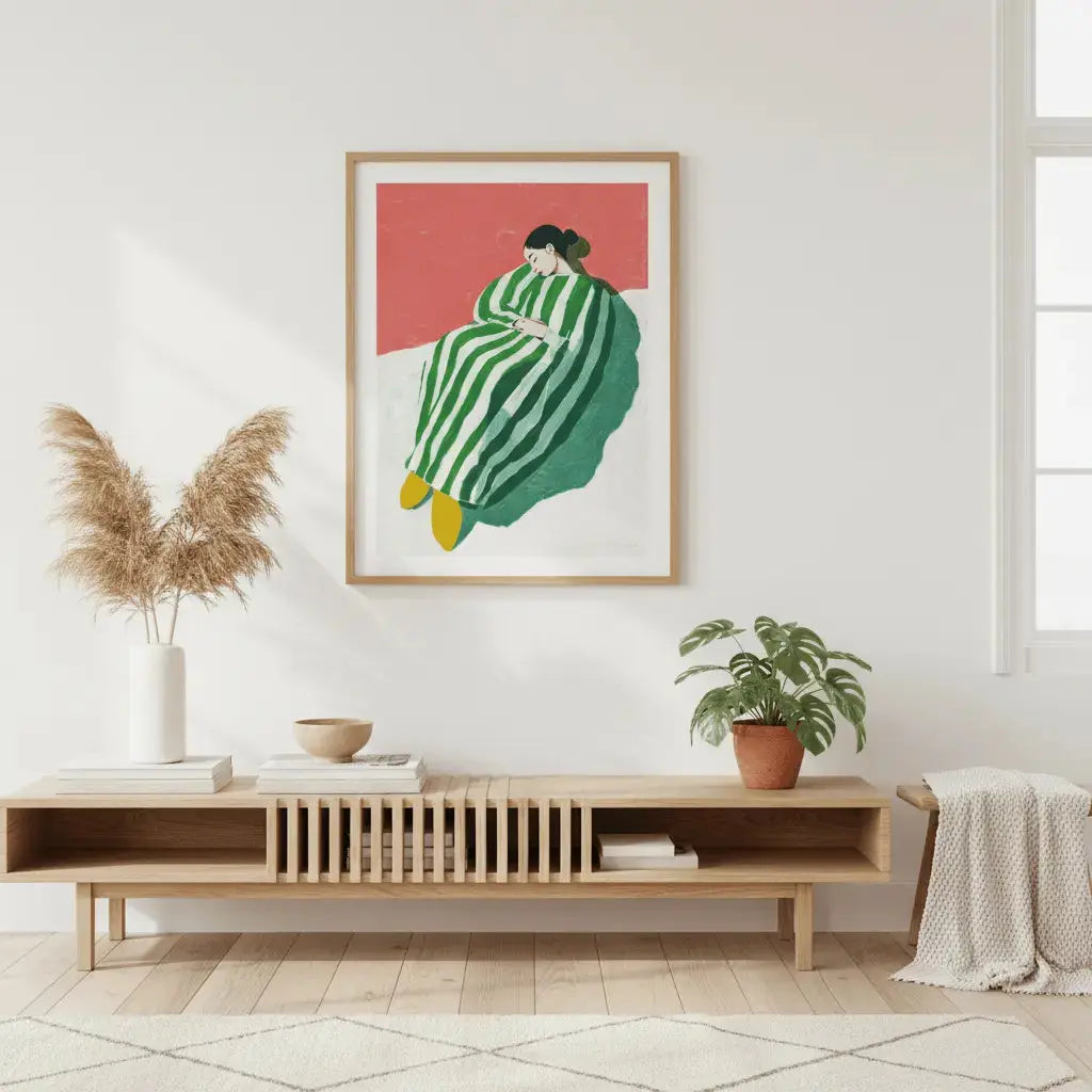Uma figura envolta em listras verdes e brancas descansando com tranquilidade. Um convite gentil para desacelerar.