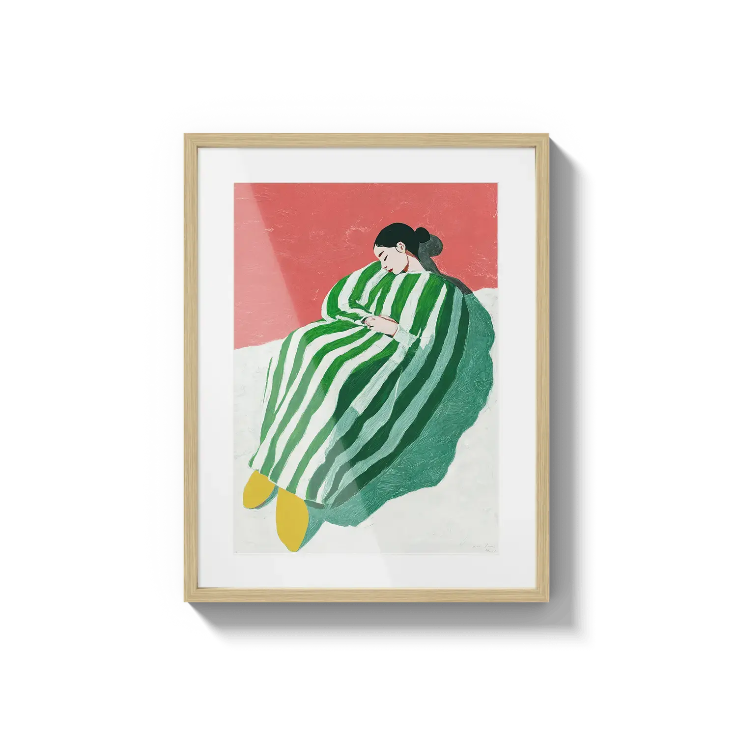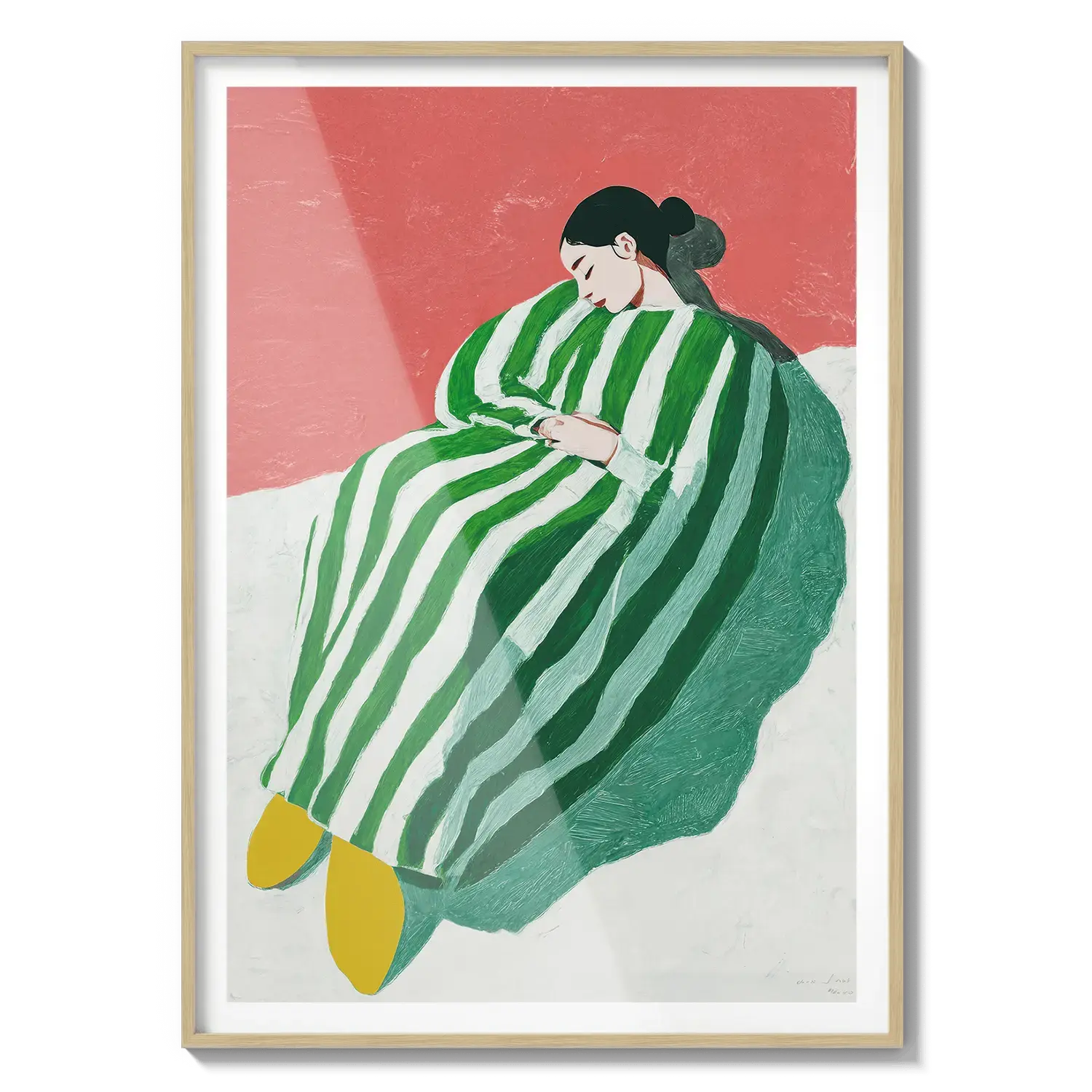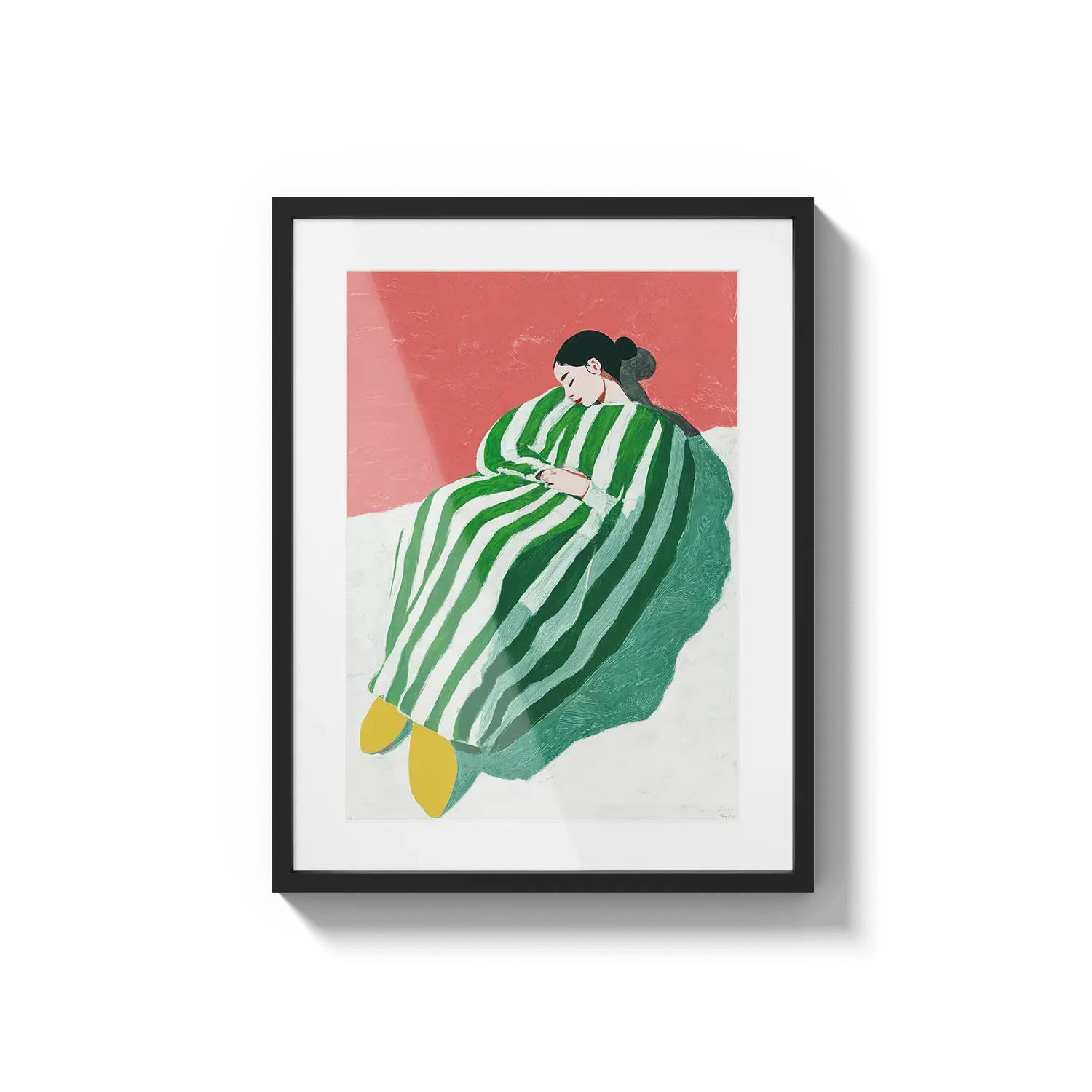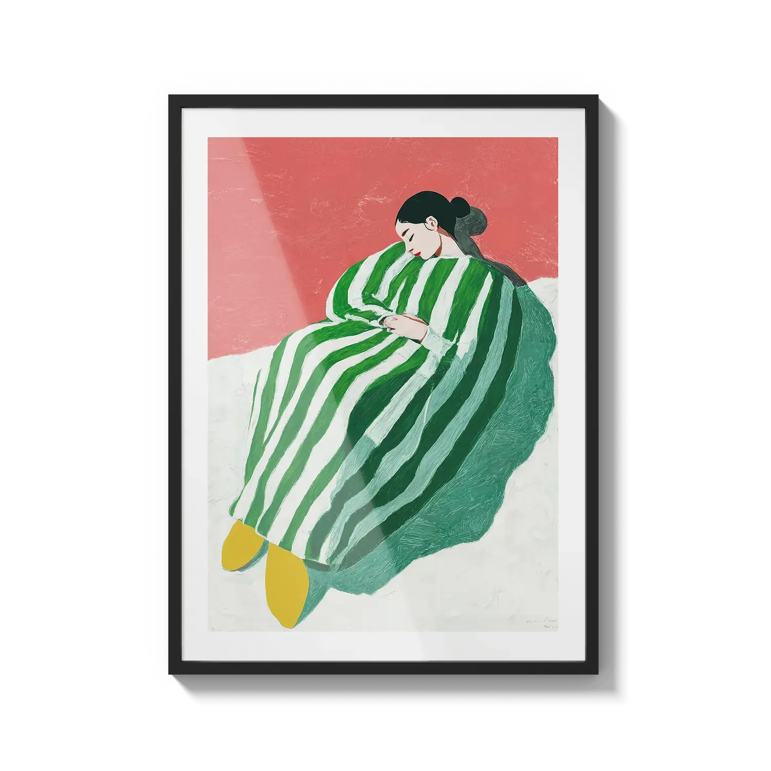 Uma figura envolta em listras verdes e brancas descansando com tranquilidade. Um convite gentil para desacelerar.