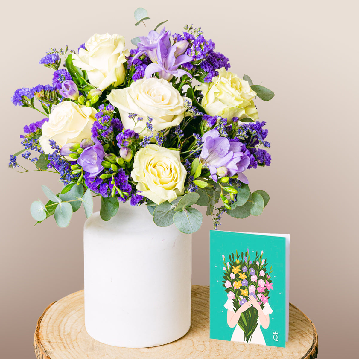 Descubra o conjunto "Toque de Elegância", que inclui o buquê "Beleza Elegante", uma linda combinação de rosas brancas, frésias e limônio roxo, um vaso branco e um cartão. Este conjunto foi criado para transmitir sofisticação e delicadeza, um presente que expressa o quanto você aprecia aquela pessoa especial que deseja surpreender. Um presente único disponível por tempo limitado!