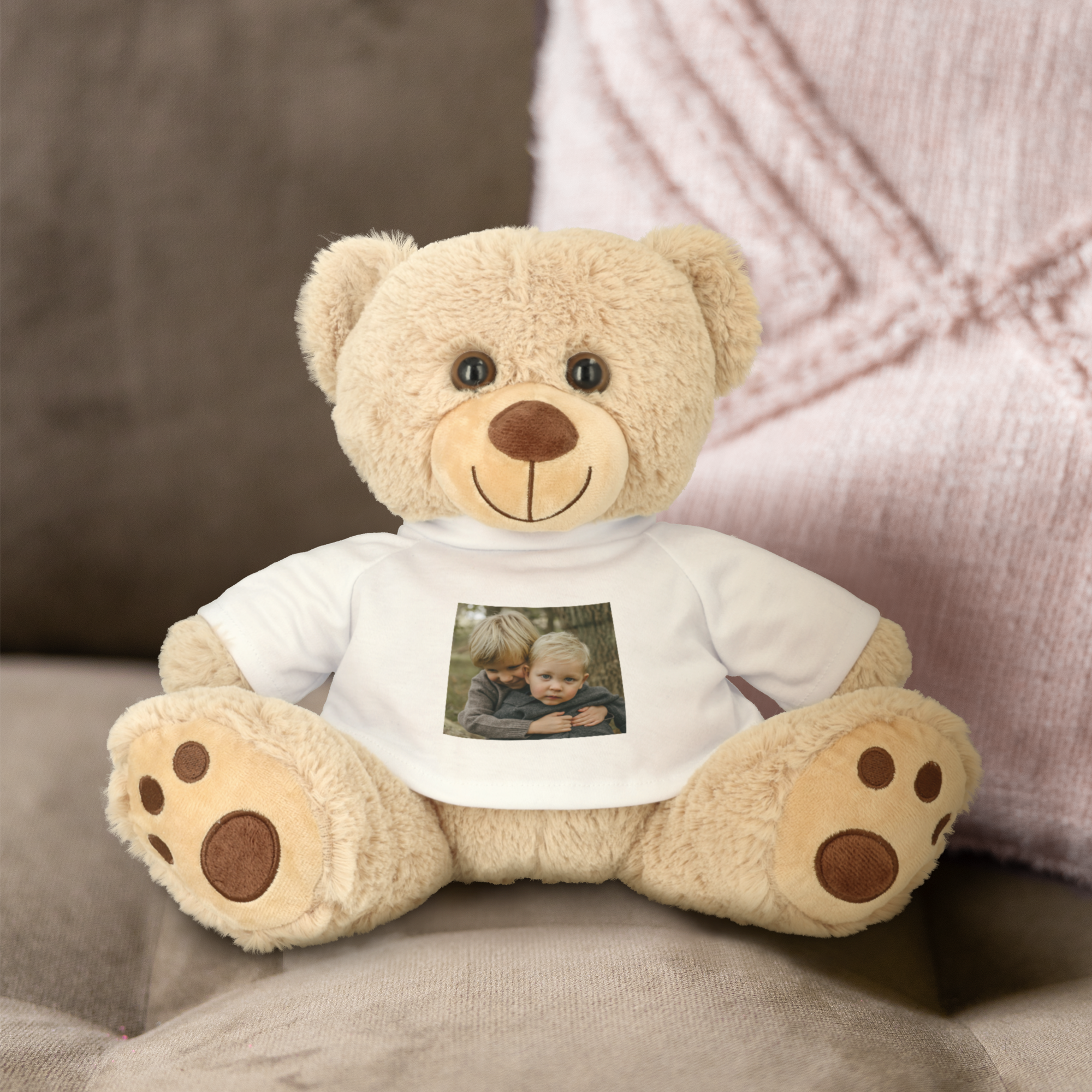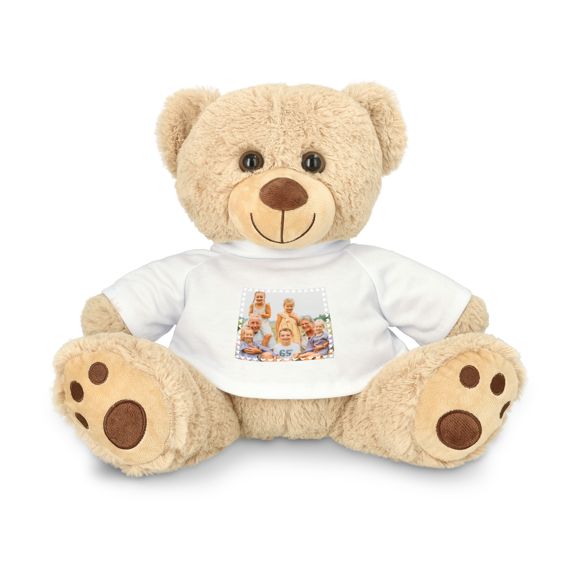 Tenha um adorável brinquedo de pelúcia vestindo uma camiseta personalizada com sua foto, nome ou texto. O presente mais aconchegante de todos!